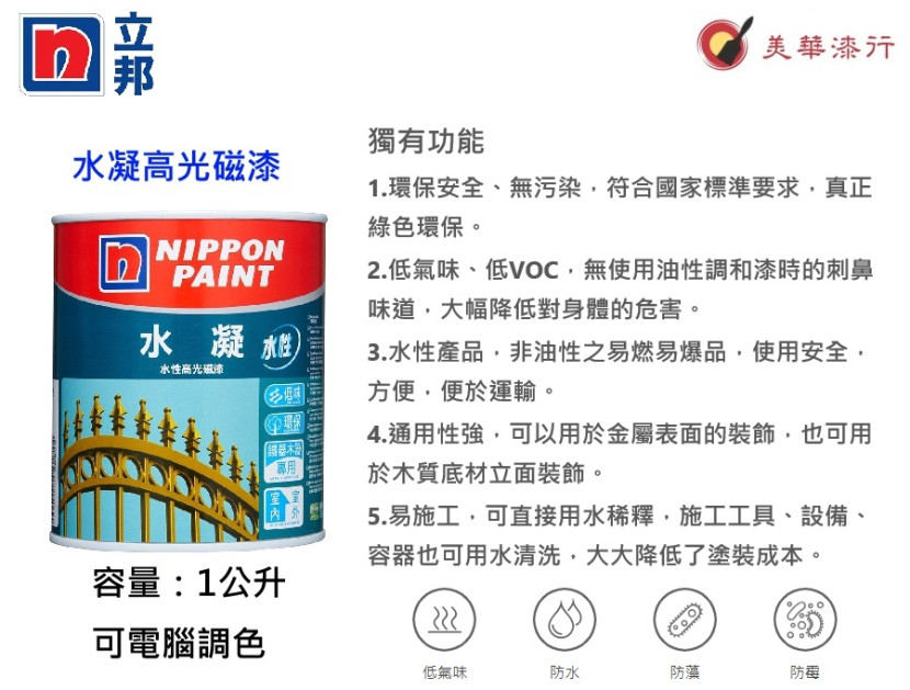 | 1. 立邦「水凝水性磁漆」是根據現代塗料環保節能的要求,以水作為稀釋劑,配合立邦水凝水性金屬底漆使用,能夠與金屬表面牢牢結合,起到防銹作用一種高光面漆。 | ||